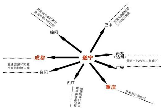 加快完善高速公路网络,努力拓展出遂铁路通道,推进机场建设和涪江复航,全面构建次级综合交通枢纽。打通东向通道,通过沪蓉、遂广高速和达成铁路,加强与南充、广安和达州等川东北城市群的合作,贯通与中部地区、长三角地区的连接;打通南向通道,通过遂渝、遂内高速和遂渝、遂内宜铁路,加强与重庆以及内江、宜宾、泸州、自贡等川南城市群的合作,贯通与珠三角地区、西南出海口和南亚出境口岸的连接;打通北向通道,通过遂绵、遂西高速和遂绵铁路,加强与绵阳等重工业基地的合作,贯通与西北地区和欧亚大陆桥边境口岸、环渤海经济区和东亚地区的连接;打通西向通道,通过沪蓉、遂资高速和遂资眉雅铁路,加强与成都城市群的合作,贯通与西藏和南亚次大陆边境口岸的连接,实现30分钟出遂、90分钟通达成渝、3小时出川、10小时通达全国主要经济圈的公路和铁路网络,实现与北京、上海、广州等城市的航空客货通航,初步打通与嘉陵江、长江主航道的货运通航,实现通江达海的目标,建成四川和成渝经济区内重要的次级综合交通枢纽。