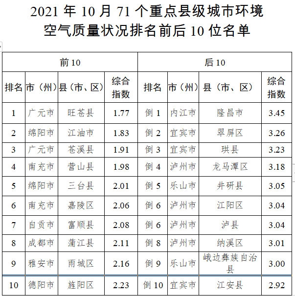 10月,四川71个重点县级城市中,71个重点县级城市中,环境空气质量较好的前10名依次为旺苍县、江油市、苍溪县、营山县、三台县、南充市嘉陵区、富顺县、蒲江县、雅安市雨城区、德阳市旌阳区;环境空气质量较差的后10名依次为隆昌市、宜宾市翠屏区、珙县、泸州市龙马潭区、井研县、泸州市江阳区和泸县(并列)、泸州市纳溪区、峨边彝族自治县、江安县。