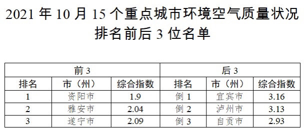 今年10月,四川15个重点城市(全国168个重点城市)中空气质量较好的前3名依次为资阳市、雅安市、遂宁市,环境空气质量较差的后3名依次为宜宾市、泸州市、自贡市。这是记者11月25日从四川省生态环境厅新闻发布会上获悉的。