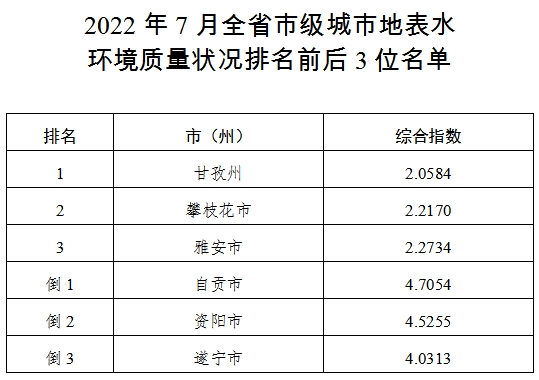 8月29日,四川省生态环境厅召开新闻发布会,会上通报了今年7月全省地表水质量排名情况。根据通报,今年7月,四川21个市级城市地表水环境质量较好的前3名依次为甘孜州、攀枝花市、雅安市,地表水环境质量较差的后3名依次为自贡市、资阳市、遂宁市。