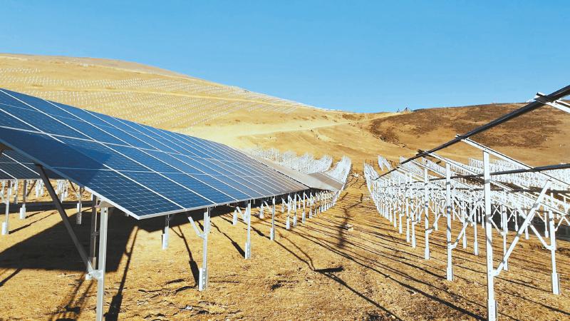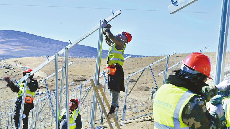 在雅江县柯拉光伏电站建设现场,光伏支架整齐划一,密密麻麻遍布山头。工人顶着烈日寒风,在钢筋桩上打入支架,固定住位置。该电站一期项目副经理康子军介绍:“目前站内光伏支架基础施工过半,支架及组件安装进入高峰,累计完成投资约18亿元,计划2023年全容量并网发电。”