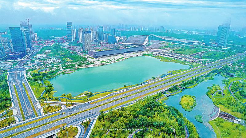 站在远处,眺望秦皇湖畔的天府国际会议中心,天蓝、水绿、瓦檐灰,三个色调和谐统一,山水融城,如诗如画,向世人展示着成都这座公园城市的独特魅力。