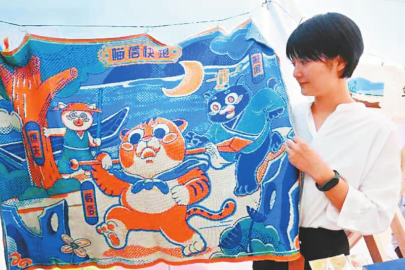 南京市博物总馆的摊位上,一件文创毯引来不少人围观。这件产品根据镇馆之宝——元青花萧何月下追韩信图梅瓶图案创作。“我们把原图案中的人物变成了当代年轻人喜欢的猫咪形象,用色大胆鲜艳。”南京市博物总馆产业发展部文创服务办副主任谢宇萌介绍。