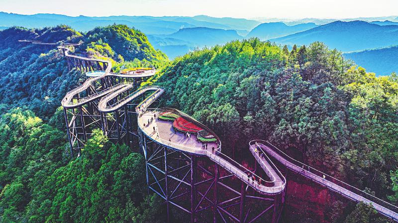 位于达州市宣汉县月亮坪乡村振兴示范区的树冠云廊,如同一条绸带穿越林间,吸引游客纷至沓来。张平 摄(C视觉)