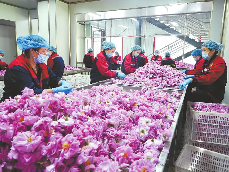 走进达维镇冒水村金山玫瑰产业基地,一股淡淡的玫瑰花香沁人心脾。当下正是玫瑰盛开时节,每天有近200名村民到基地帮工。带着露水的玫瑰经人工清理后放进生产线,干花、精油等产品从生产线另一边不断下线。