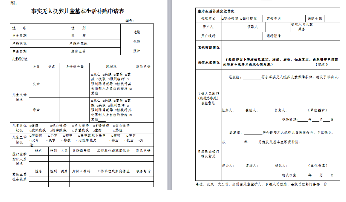 (一)申请。事实无人抚养儿童监护人或受监护人委托的近亲属可向儿童户籍所在地乡镇人民政府(街道办事处)提出救助申请。情况特殊的,可由儿童所在村(居)民委员会提出申请。申请时如实填写《事实无人抚养儿童基本生活补贴申请表》(附件),并提交以下父母双方或其中一方的相关材料:
