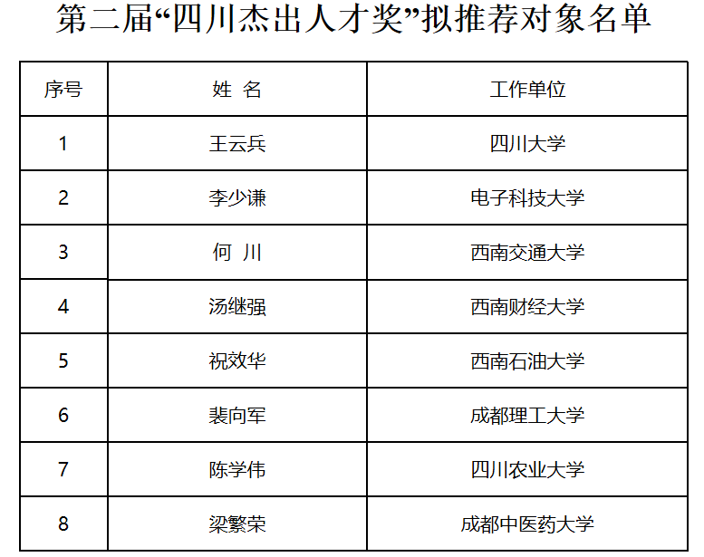根据省人才办《关于开展第二届“四川杰出人才奖”评选活动的通知》(川人才办〔2019〕25号)要求,在有关高校推荐基础上,经审核,现将第二届“四川杰出人才奖”拟推荐对象予以公示,公示时间9月19日至9月25日。公示期内若有异议,请以真实姓名通过电话或电子邮件方式反映。