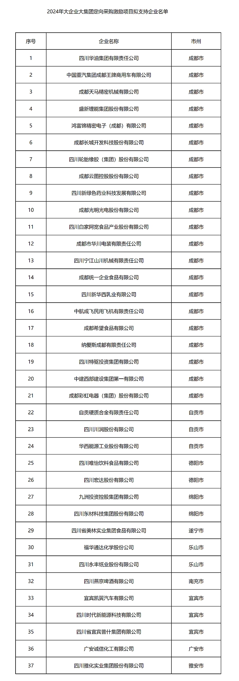 按照《工业类专项资金项目严格实施全流程管理监督的暂行办法》的通知(川经信财资〔2024〕108号)和《关于组织申报大企业大集团定向采购激励项目的通知》(川经信办函〔2024〕264号)要求,经企业自主申报、市(州)经济和信息化局推荐、专家评审、现场核实等环节,现将2024年大企业大集团定向采购激励项目拟支持名单予以公示。