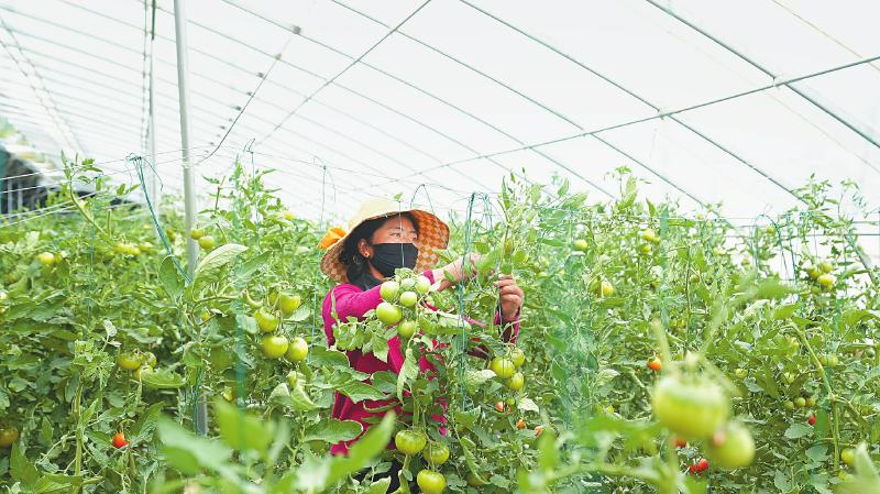 台州市玉环市援建的甘孜州炉霍县冬春季蔬菜保供基地内,当地工人正在为番茄整理枝条。