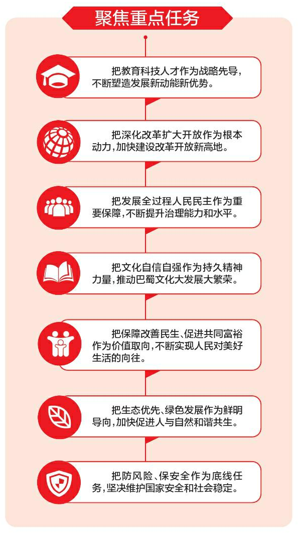 省委十二届二次全会谋划了四川现代化建设的宏伟蓝图。实现目标愿景,进一步分解任务书、路线图尤为重要。那么,写好中国式现代化的四川篇章,为四川现代化建设提供有力支撑,将聚焦哪些重点任务?我们一起走进会场“划重点”。