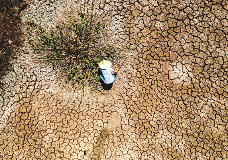 8月13日,泸州市纳溪区打古镇双家村的小龙虾养殖户高启民在虾塘里查看小龙虾,由于干旱少雨,养虾塘里的水已经干涸了。