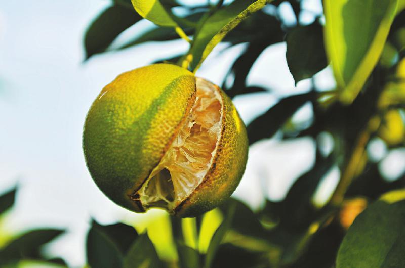 8月15日,内江市资中县重龙镇尖峰村血橙种植园里的柑橘因高温干旱天气已经爆裂。