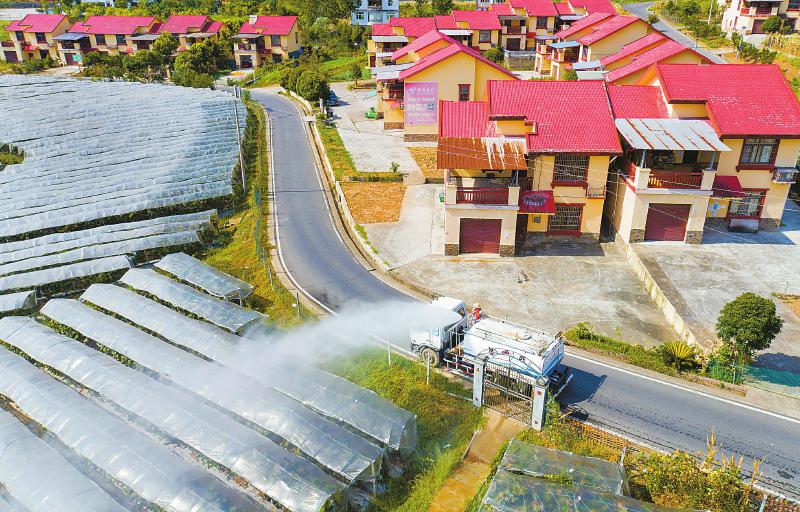 8月18日,水罐车在为巴中市恩阳区下八庙镇安居村葡萄产业园喷水抗旱。