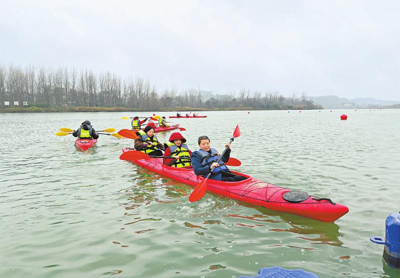 游客在资阳雁江水上运动基地划船。记者 郝飞 摄