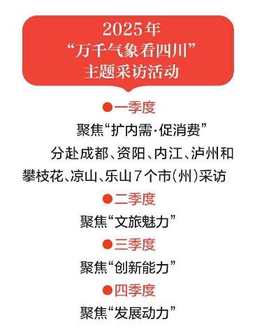 触摸发展新脉动,展现发展新活力,生动讲好四川发展新故事,今年的“万千气象看四川”主题采访活动同样精彩纷呈。根据安排,四川将分专题、分批次、分层次组织集中采访。其中,一季度聚焦“扩内需·促消费”主题,反映四川大力提振有效需求、充分释放消费活力的进展成效。二季度计划聚焦“文旅魅力”主题,反映四川推进文旅融合发展的工作成效。三季度计划聚焦“创新能力”主题,深入各类产业园区采访报道,反映全省建设具有四川特色的现代化产业体系最新成果。四季度计划聚焦“发展动力”主题,总结盘点四川贯彻落实党的二十届三中全会精神、推动深层次改革和高水平开放的最新工作成果等。