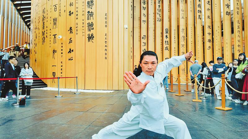 青城武术非遗代表性传承人身着白色传统练功服,展现了绝妙的“青城十八式”以及太极推手等招式,动作行云流水,刚柔并济,引得现场观众连连鼓掌称赞。
