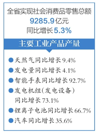 消费领域,按消费形态分,餐饮收入1303.2亿元,同比增长4.6%;商品零售7982.7亿元,同比增长5.4%。在商品零售中,限额以上企业(单位)通过互联网实现商品零售额671.4亿元,同比增长27.1%。