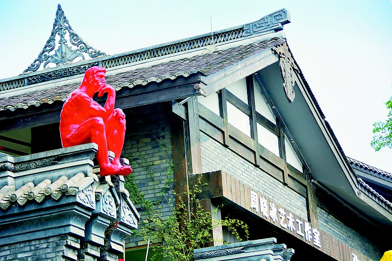 陆鸣口中的“艺术气息”,在紧邻洛带古镇老街、占地200亩的“中国艺库”随处可见。刚刚开街的手工艺街,蜀绣、陶艺、棕编、炭雕、夏布等各类店铺,吸引了许多游人入内参观、体验、选购。此外,在这里还有清华大学美术学院副院长苏丹2014年9月创办的“四面空间艺术机构”,当代艺术博物馆等。而艺术家周晓冰工作室窗外,安放的两尊红色、黄色的“沉思者”雕塑,则成为老街与“中国艺库”交界处游人围观的醒目标志。