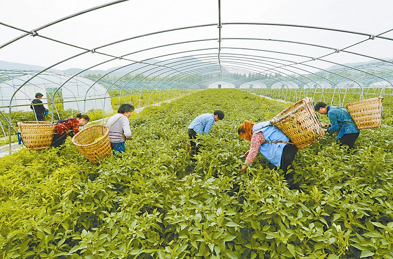 射洪县洋溪镇蔬菜基地内,当地农民忙着收获青椒。