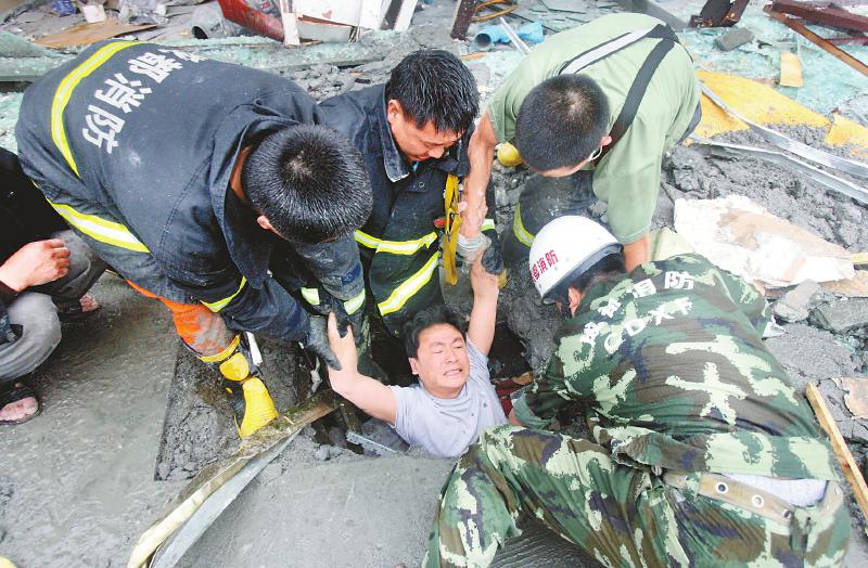 “5·12”汶川特大地震发生后,成都消防指战员在都江堰市解救遇险群众。