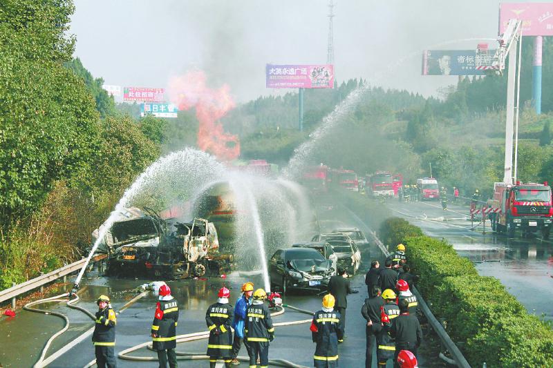 德阳消防指战员处置成南高速苍山段一槽车车祸后泄漏爆燃事故现场