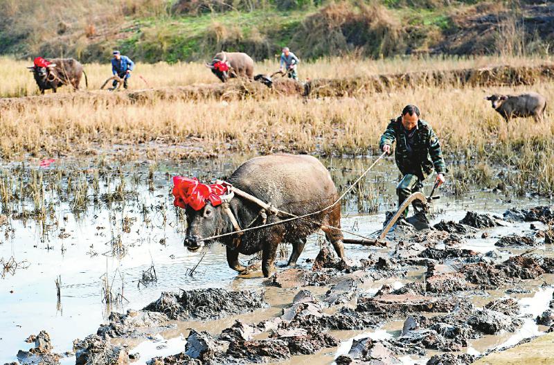 今日立春。2月3日,广安市岳池县临溪镇王家坪村的几位村民在田间“犁春牛”,迎接新春来临。特约通讯员邱海鹰摄(视觉四川)
