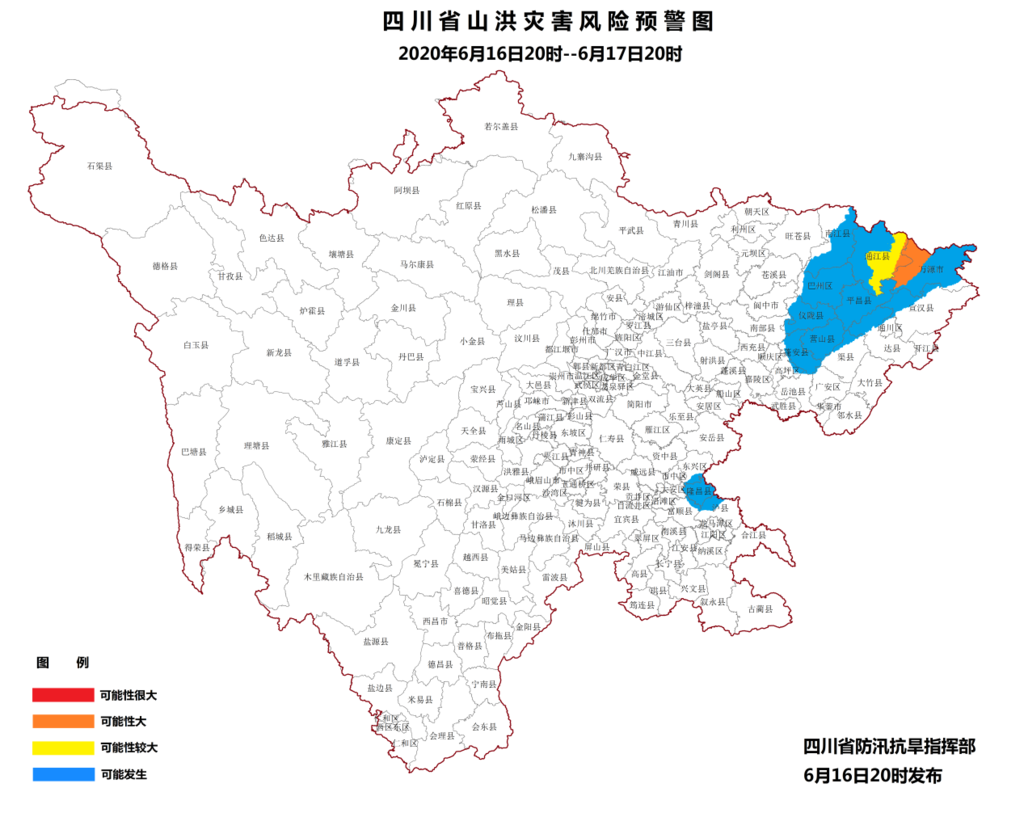6月16日20时至17日20时,万源、通江等县(市、区)发生山洪灾害可能性大,南江、巴州、平昌、宣汉、仪陇、营山、蓬安、通川、隆昌等县(市、区)可能发生山洪灾害。