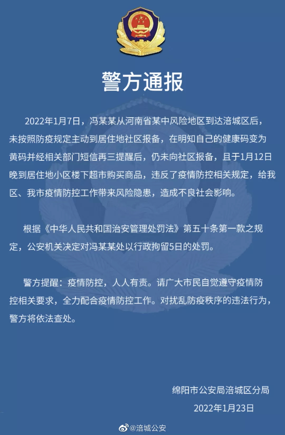 通报称:2022年1月7日,冯某某从河南省某中风险地区到达涪城区后,未按照防疫规定主动到居住地社区报备,在明知自己的健康码变为黄码并经相关部门短信再三提醒后,仍未向社区报备,且于1月12日晚到居住地小区楼下超市购买商品,违反了疫情防控相关规定,给涪城区、绵阳市疫情防控工作带来风险隐患,造成不良社会影响。