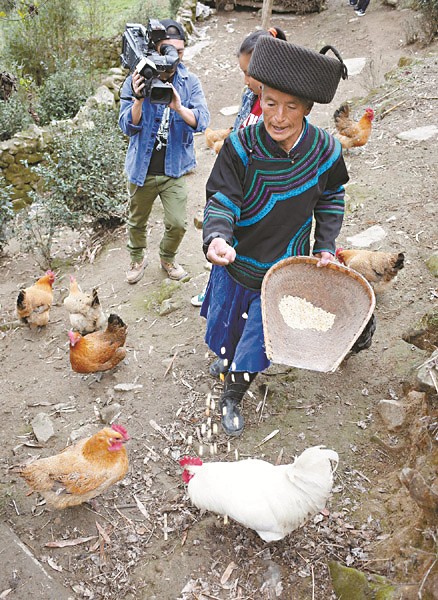在我们将要离去时,啥妈革批老人拿起簸箕,盛满玉米去喂鸡。鸡舍离他家房子几十米左右,他一边走,嘴里一边发出“喔喔”吆喝声,听到声音,肥壮的公鸡母鸡,从草丛中、绿树下,一拥而出,有的甚至从山坡上飞下来,像淘气的孩子,直扑啥妈革批。