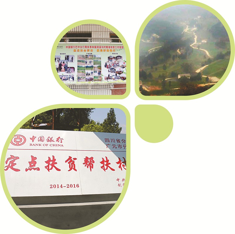 1、中国银行四川省分行定点扶贫帮扶村。2、中国银行四川省分行扶贫工作剪影展板。3、由中国银行四川省分行援建的贫困山区道路。