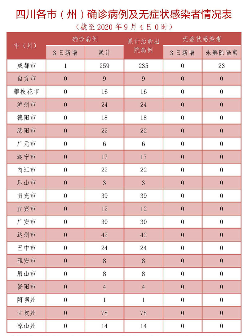 四川省新型冠状病毒肺炎疫情最新情况(9月4日发布)