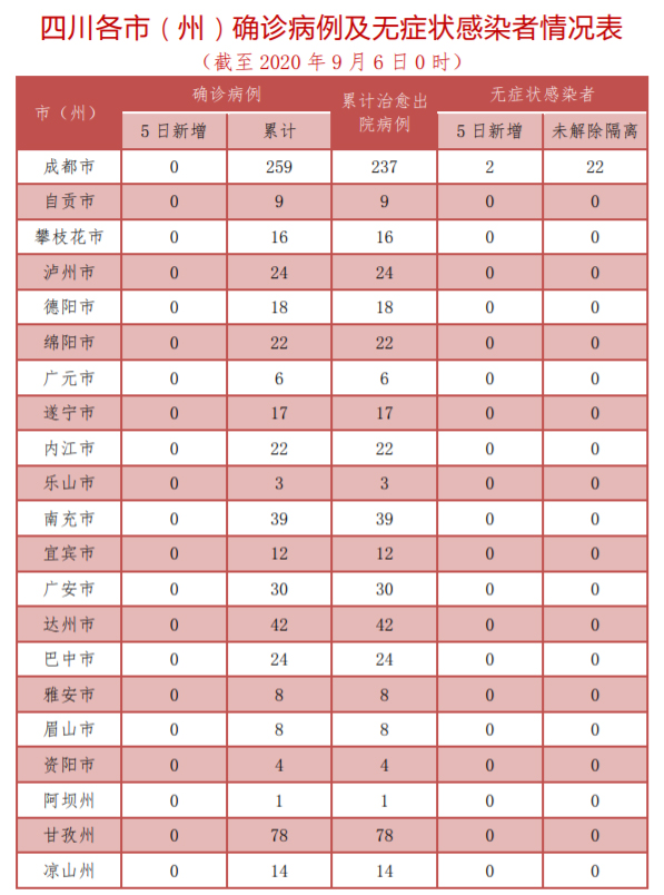 四川省新型冠状病毒肺炎疫情最新情况(9月6日发布)