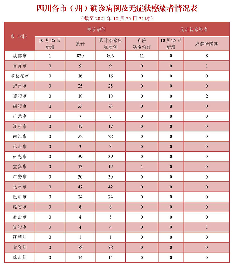 四川省新型冠状病毒肺炎疫情最新情况(10月26日发布)