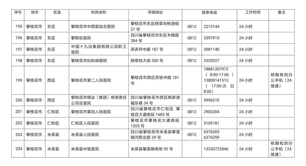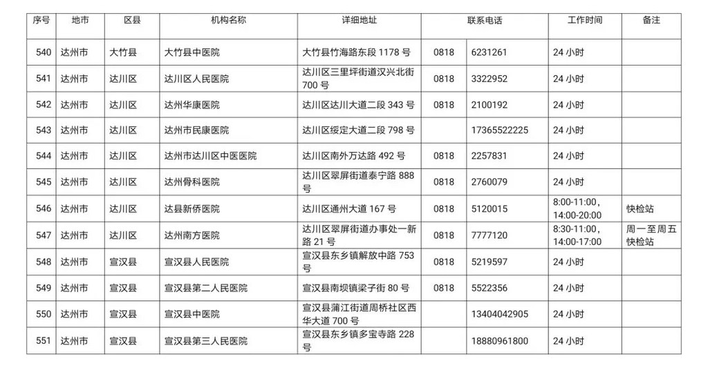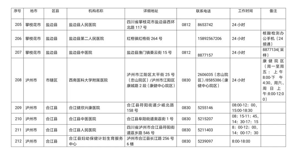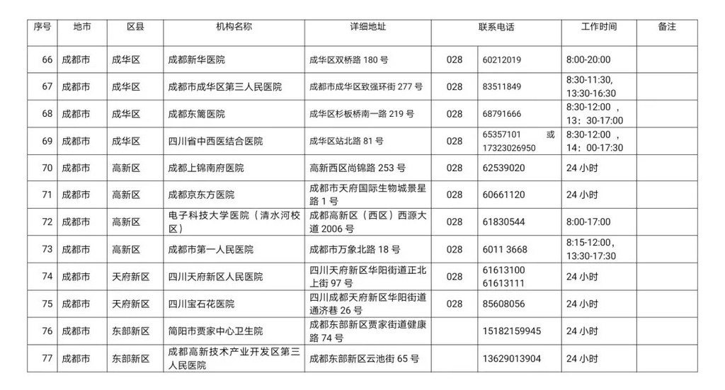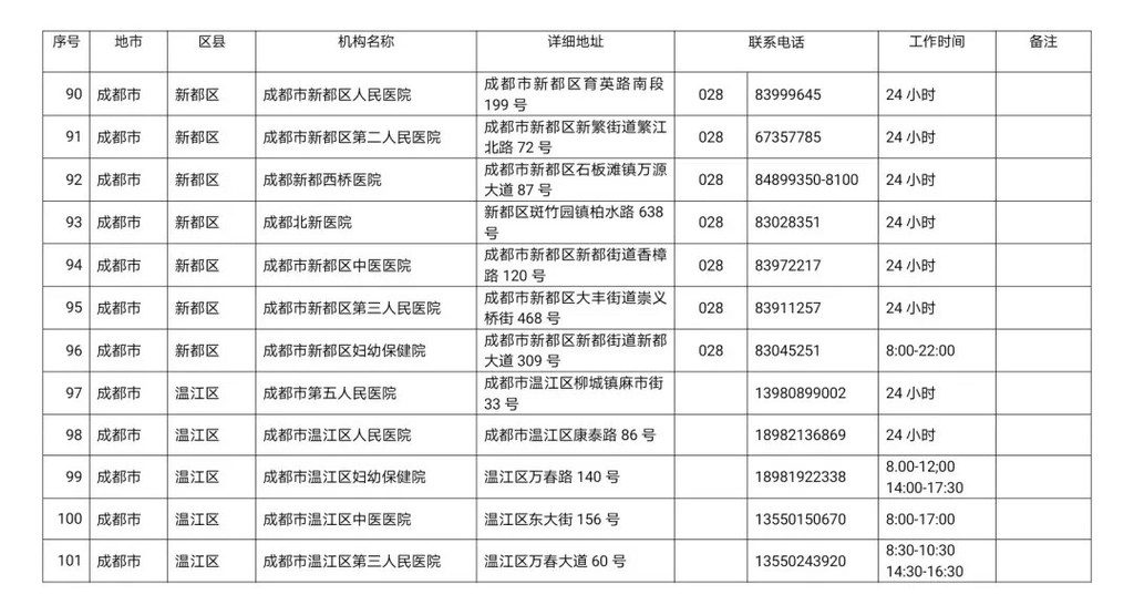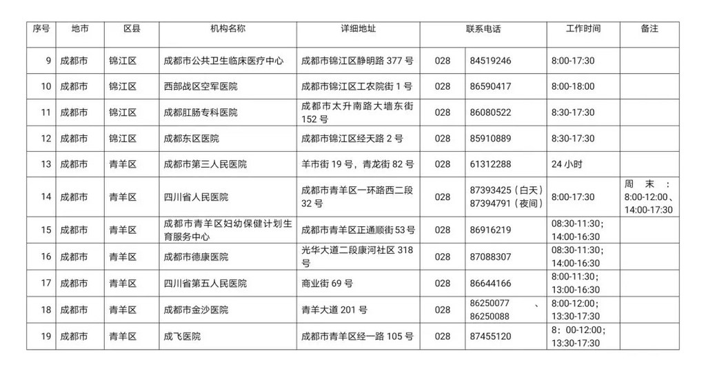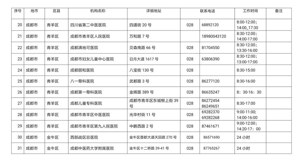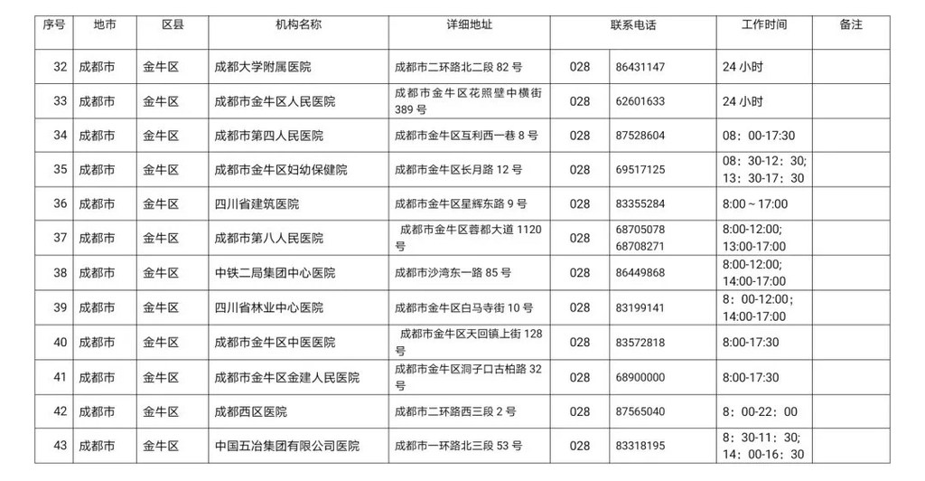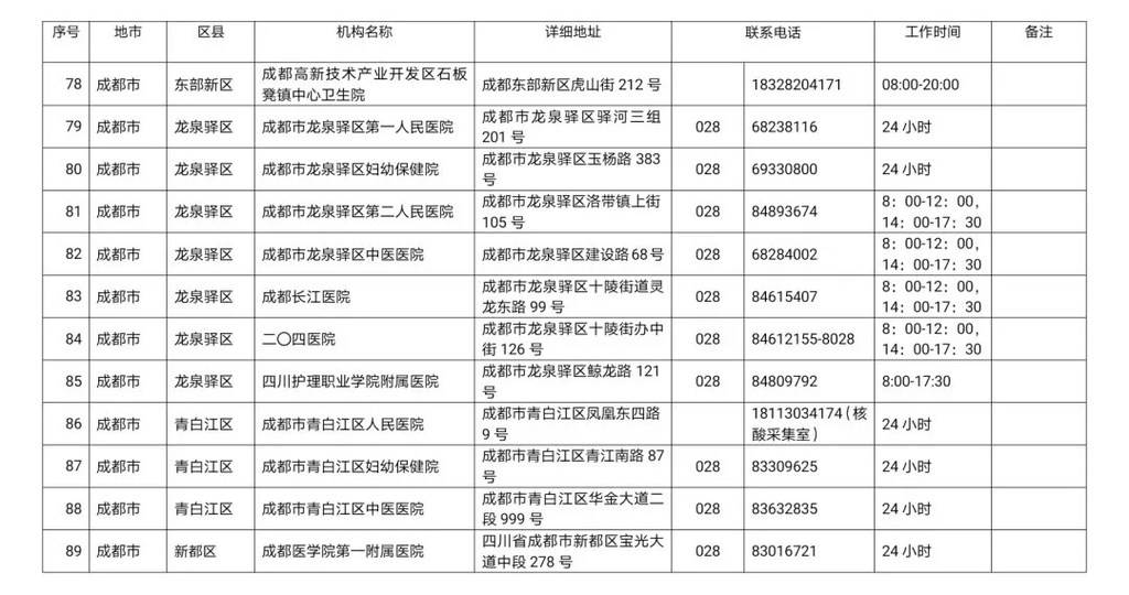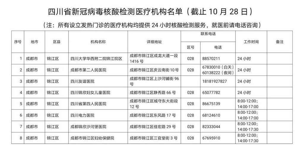 四川省新冠病毒核酸检测医疗机构名单