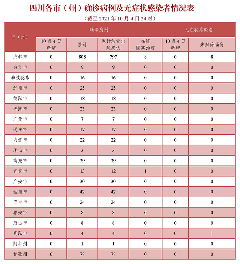 10月4日0-24时,四川无新增新型冠状病毒肺炎确诊病例,无新增治愈出院病例,无新增疑似病例,无新增死亡病例。