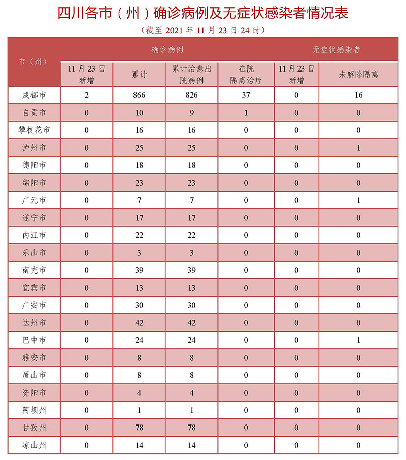 四川省新型冠状病毒肺炎疫情最新情况(11月24日发布)