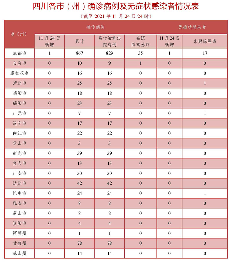四川省新型冠状病毒肺炎疫情最新情况(11月25日发布)