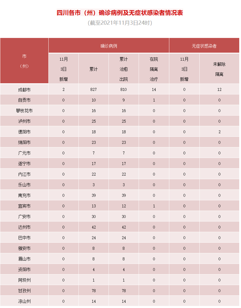四川省新型冠状病毒肺炎疫情最新情况(11月4日发布)