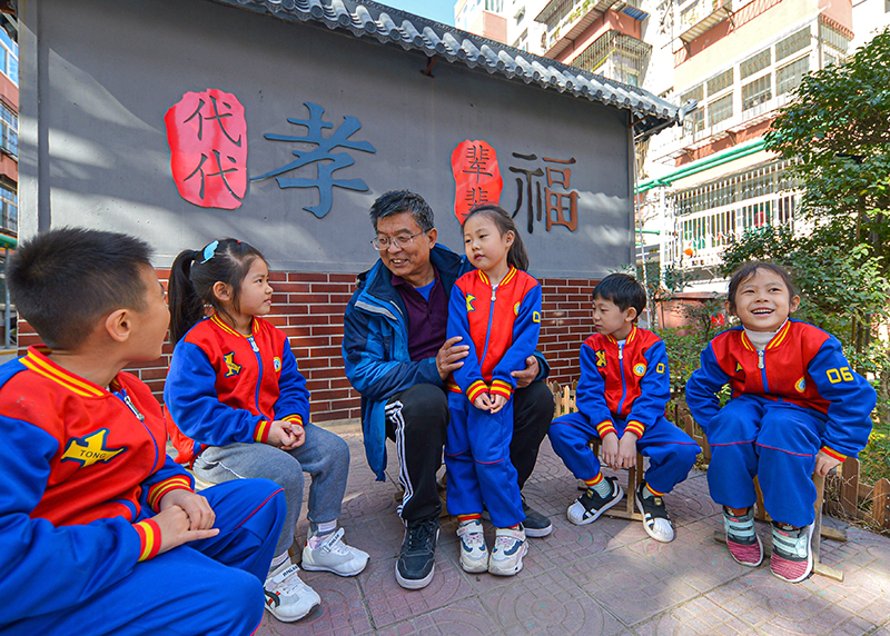 在河北省邯郸市邯山区开展的“听爷爷奶奶讲家风”主题活动中,宣讲员向孩子们讲家风家训故事(2020年11月2日摄)。新华社记者 王晓 摄