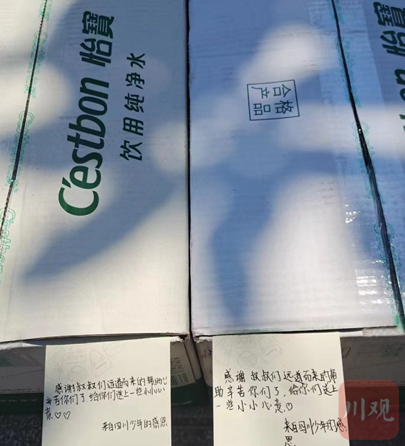 一对小姐弟送来一箱矿泉水,上面还写着暖心的纸条:“感谢叔叔们远道而来的帮助,辛苦你们了,给你们送上一些小小心意。”落款是:来自四川少年的感恩。