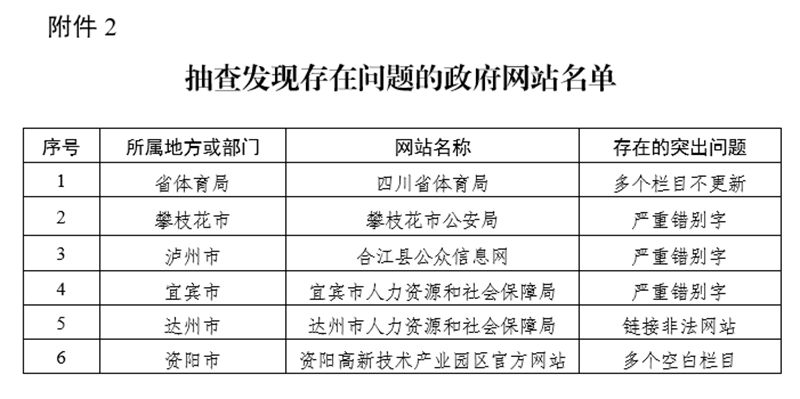 (一)政府网站方面。仍有个别网站信息发布审核把关不严,出现严重表述错误或内容不准确等问题,如“攀枝花市公安局”“宜宾市人力资源和社会保障局”等网站。一些政府网站专题专栏建设缺乏系统性推进,对失效专题专栏未能及时进行归类、归档处理。有的网站日常监测不到位,出现非法链接、页面错乱等问题,如“达州市人力资源和社会保障局”网站。一些政府网站信息更新工作落实不到位,如“四川省体育局”“资阳高新技术产业园区”网站存在多个栏目不更新、空白栏目较多的问题。“四川省人力资源和社会保障厅”“四川省市场监督管理局”“四川政务服务网”等网站办理“我为政府网站找错”留言速度慢、答复质量不高。个别网站主管单位未健全常态化监管机制,未严格落实政府网站域名管理规定,未经批准私自注销域名,长期脱离监管,有的非政府门户网站违规使用一级域名。“四川省情网”“信用中国(四川)”“四川省人民防空办公室”等政府网站转载重要信息不积极,未按要求及时转载党中央、国务院重要信息。