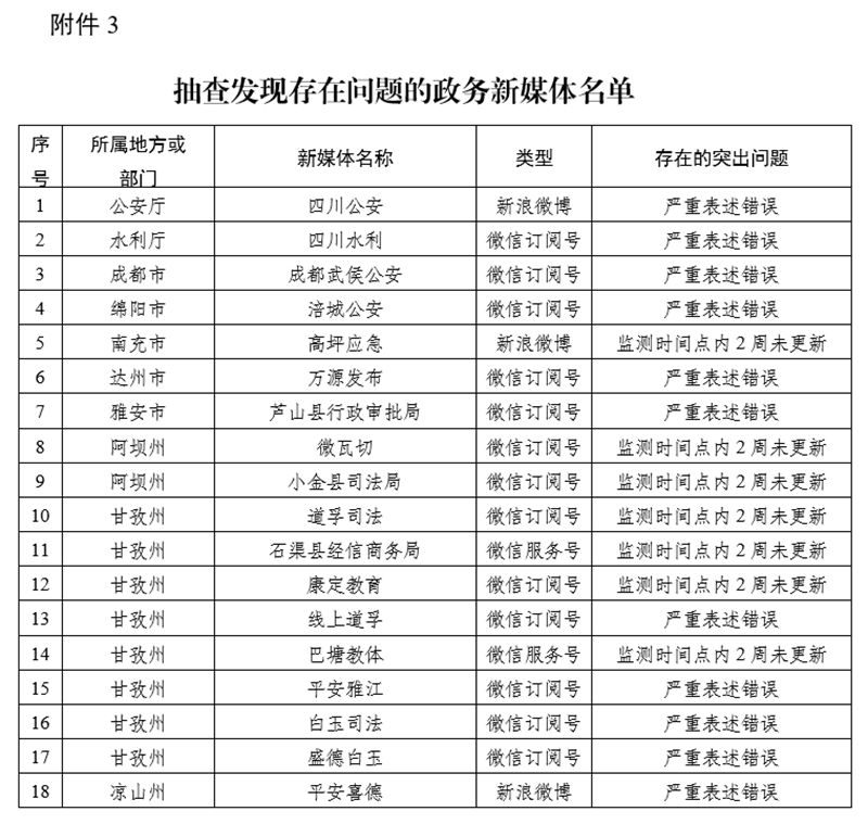 (二)政务新媒体方面。部分政务新媒体内容保障能力不足,内容质量不高的情况突出。“道孚司法”“小金县司法局”微信订阅号等8个政务新媒体监测时间点内2周无更新,“四川水利”微信公众号、“平安喜德”新浪微博等11个账号出现严重表述错误。此外,还有部分单位未严格落实《四川省人民政府办公厅关于创新完善机制加强全省政府系统政务新媒体管理的通知》(川办函〔2022〕89号)有关规定,新媒体账号主体、名称等信息变更未及时报备,导致实际运行账号与“全国政务新媒体信息报送系统”备案信息不一致,如“康定教育”“马尼干戈镇人民政府”微信订阅号已完成平台注销,但未在监管系统中申请关停,造成监管数据不准确。