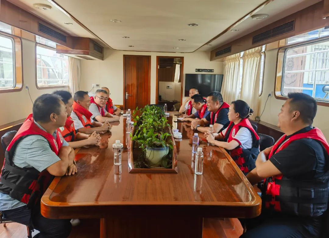 太阳当头,巡艇畅游。8月22日,苍溪县、阆中市河长制办公室,水利(务)局相关人员冒着35度的高温,再次如约而至,联袂开展对嘉陵江苍溪县至阆中市水域的常态巡查。在苍溪县海事处海巡艇的会议室就此次巡查事宜进行沟通,达成一致共识,沿江而行,顺江而下,艇在水上行,无人机在空中俯瞰,采取“水空”联动巡查,对沿途的砂石加工料场、建筑物、排污口等进行检查。自苍阆开展联袂行动以来,共巡河6次,查处违法行为2起,查处4人,处罚款5万元,召开联席会6次,发现共性问题3个,个性问题5个,提出解决问题办法9条,清运垃圾1100多吨,取缔采砂加工料场27处,对检查发现的问题分别建立整改台账、备忘录,定期限时整改销号。