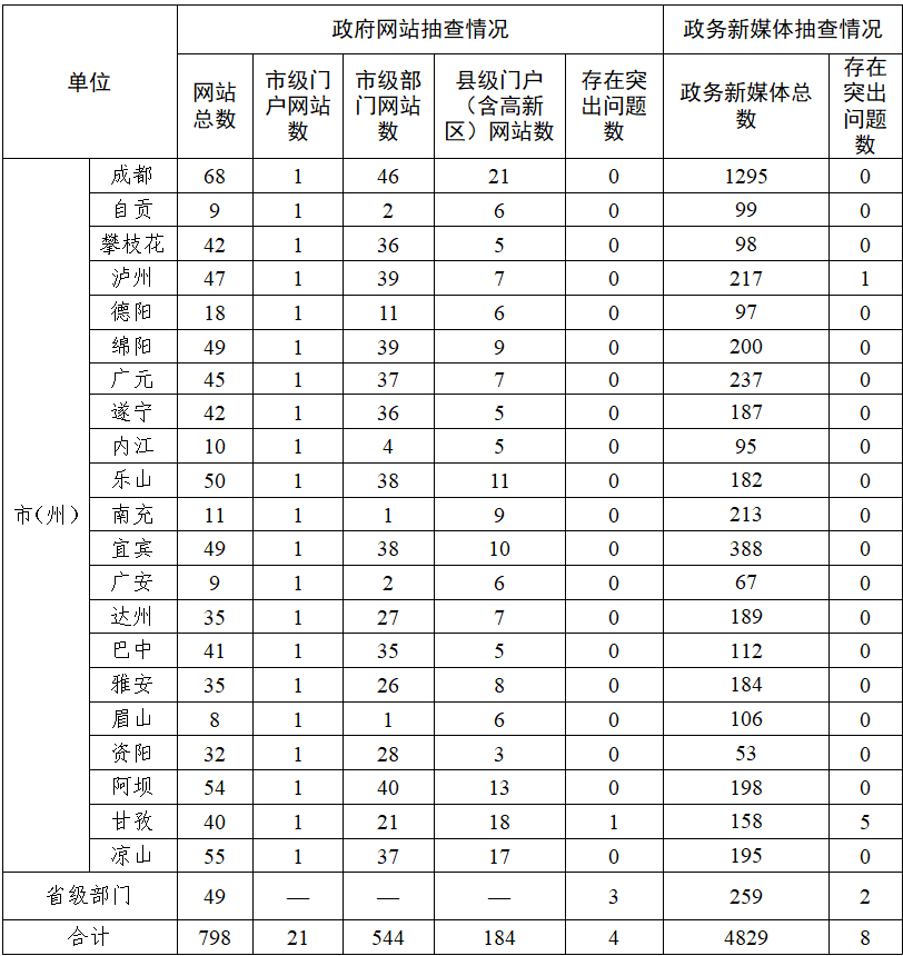 (一)政府网站。全覆盖检查各市(州)、省直部门(单位)在运行的政府网站798个,发现存在突出问题的政府网站4个,合格率99.50%。成都、攀枝花、广元、达州、阿坝等20个市(州)的政府网站合格率较高。