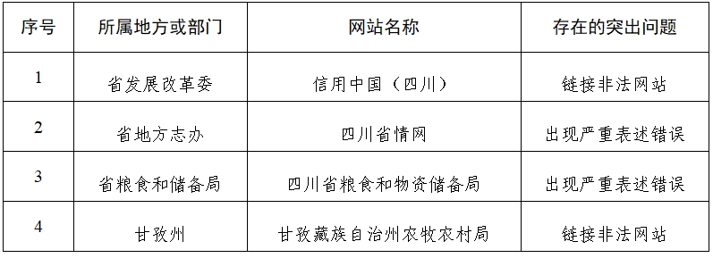 (一)政府网站运维保障水平仍需提升。个别单位如省地方志办、省粮食和储备局网站信息发布审查不严格,发布或转载的稿件存在错别字、敏感词或其他不当信息。有的网站未做好日常巡检和监测,未能第一时间对暗链、外链等不良网站进行监测预警和有效处理,如“信用中国(四川)”“甘孜藏族自治州农牧农村局”网站存在非法链接。有的单位未及时更新栏目信息、数据目录,如省发展改革委网站“发改工作”个别子栏目应更新未更新。一些地方虽然把业务系统集约整合到本单位政府网站,但管理未能到位导致“体外循环”,出现网站标识缺失、链接不可用、下载内容不正确等问题。