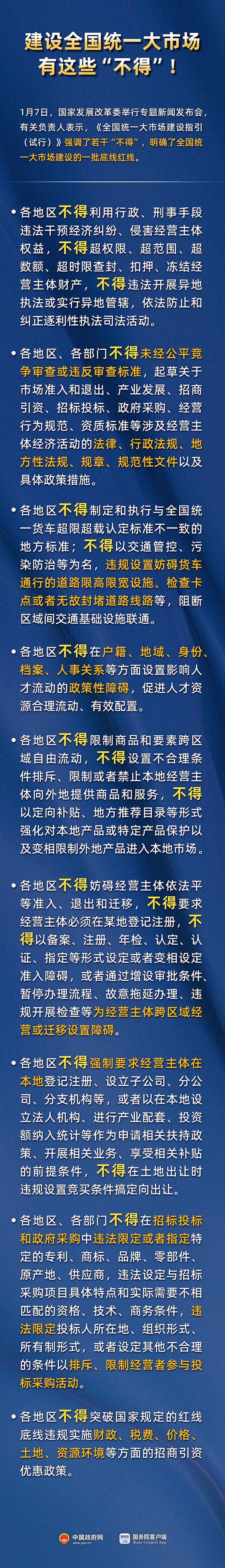 1月7日,国家发展改革委举行专题新闻发布会,有关负责人表示,《全国统一大市场建设指引(试行)》强调了若干“不得”,明确了多方面的禁止性规定。禁止做的属于底线红线,如果触碰了就要承担相应的责任。相关问题线索一经核实就要限期整改,整改不到位还会通报、约谈有关负责人。