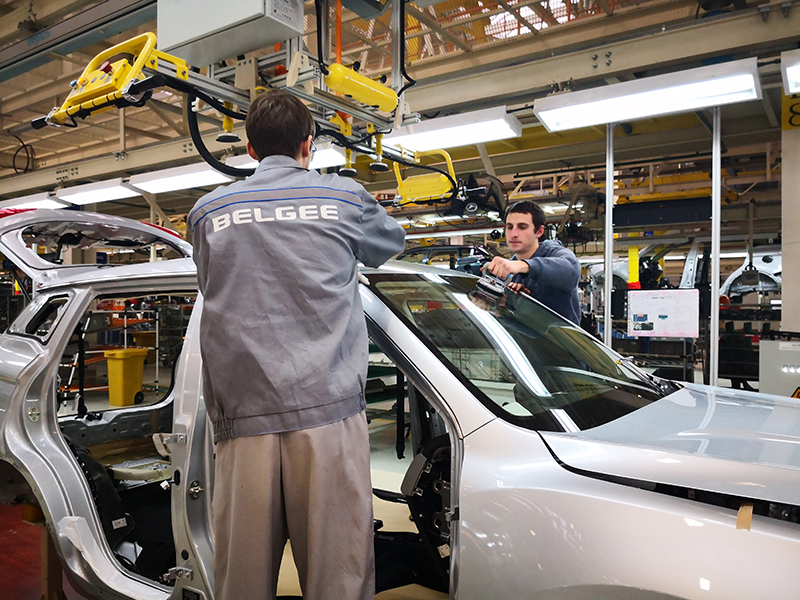 这是2018年12月1日在白俄罗斯首都明斯克东北方向50公里处的白俄罗斯吉利全散件汽车制造厂总装车间拍摄的工人组装车体。 新华社记者 张若玄 摄