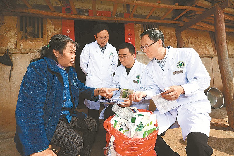 遂宁市中心医院“精准扶贫”送医下乡小分队的外科专家来到蓬溪县黄泥乡高岩村,为当地群众开展免费健康服务。图为医院专家正在给村民义诊。 (钟敏 摄 视觉四川)