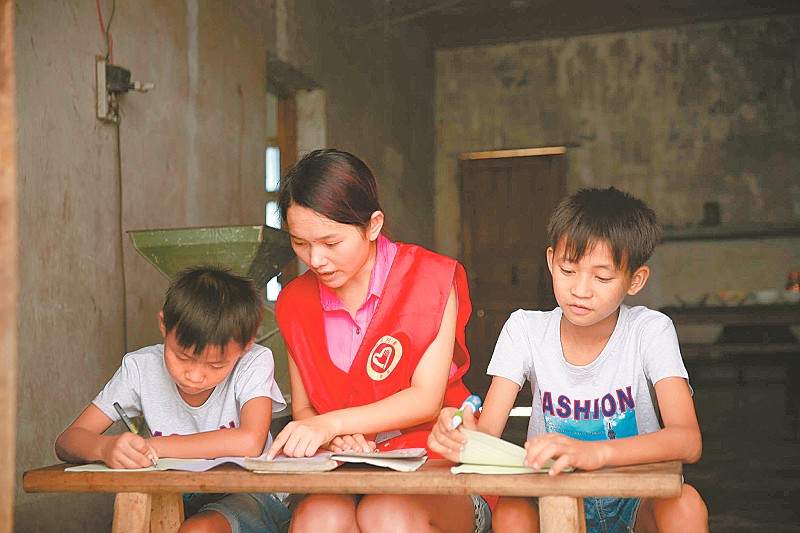 图为大学生林红,在辅导华蓥市观音溪镇大屋嘴村的留守儿童做暑假作业。 (游青 摄 视觉四川)