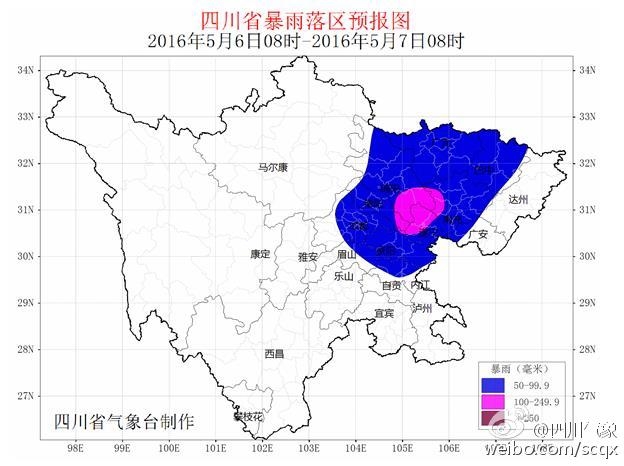 四川省气象台5月6日7时30分发布暴雨蓝色预警:6日08时~7日08时,广元、绵阳、巴中、南充、遂宁、德阳、成都、资阳8市的部分地方有暴雨,局部地方有大暴雨,并伴有雷电、局地阵性大风和冰雹。